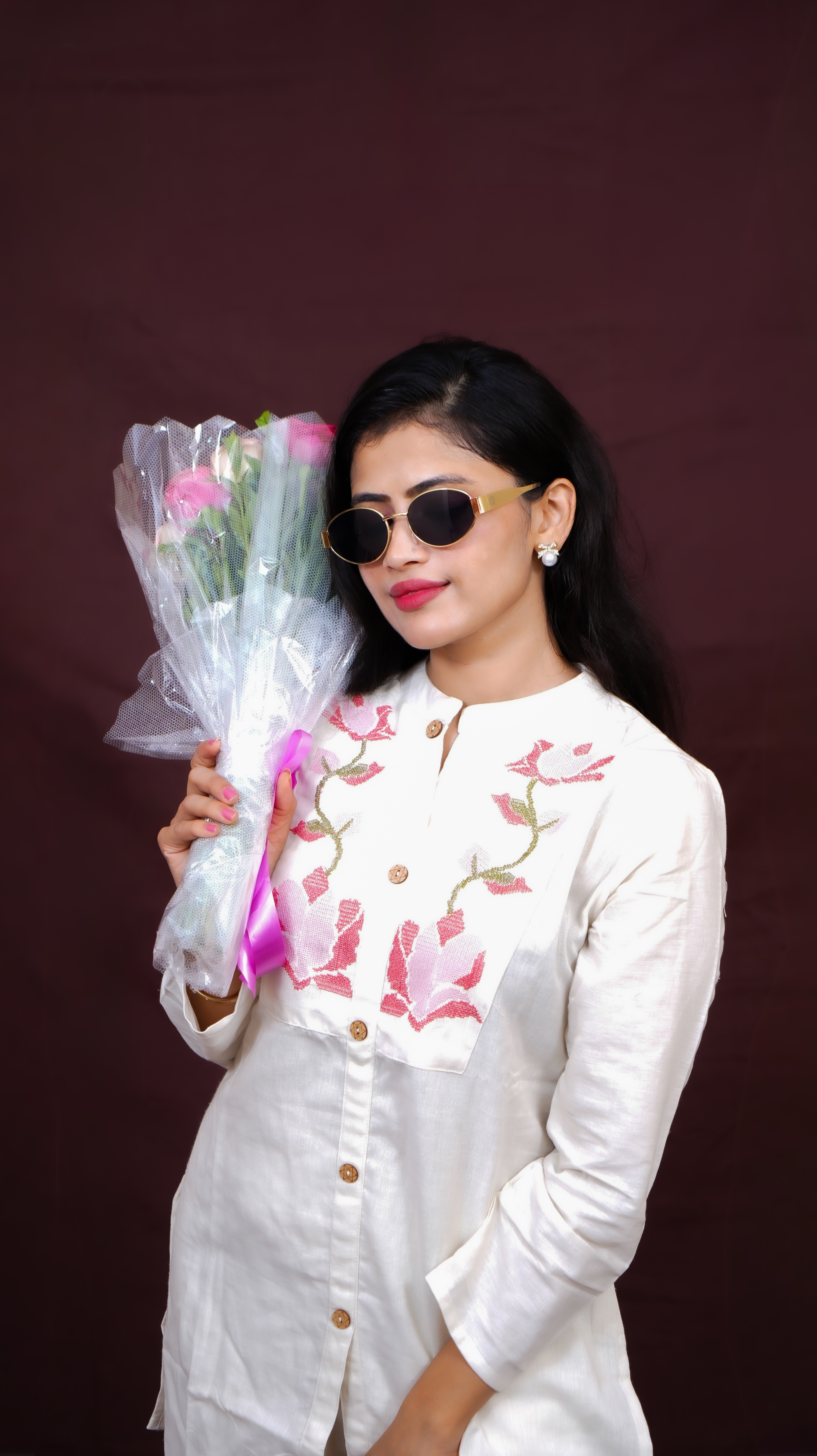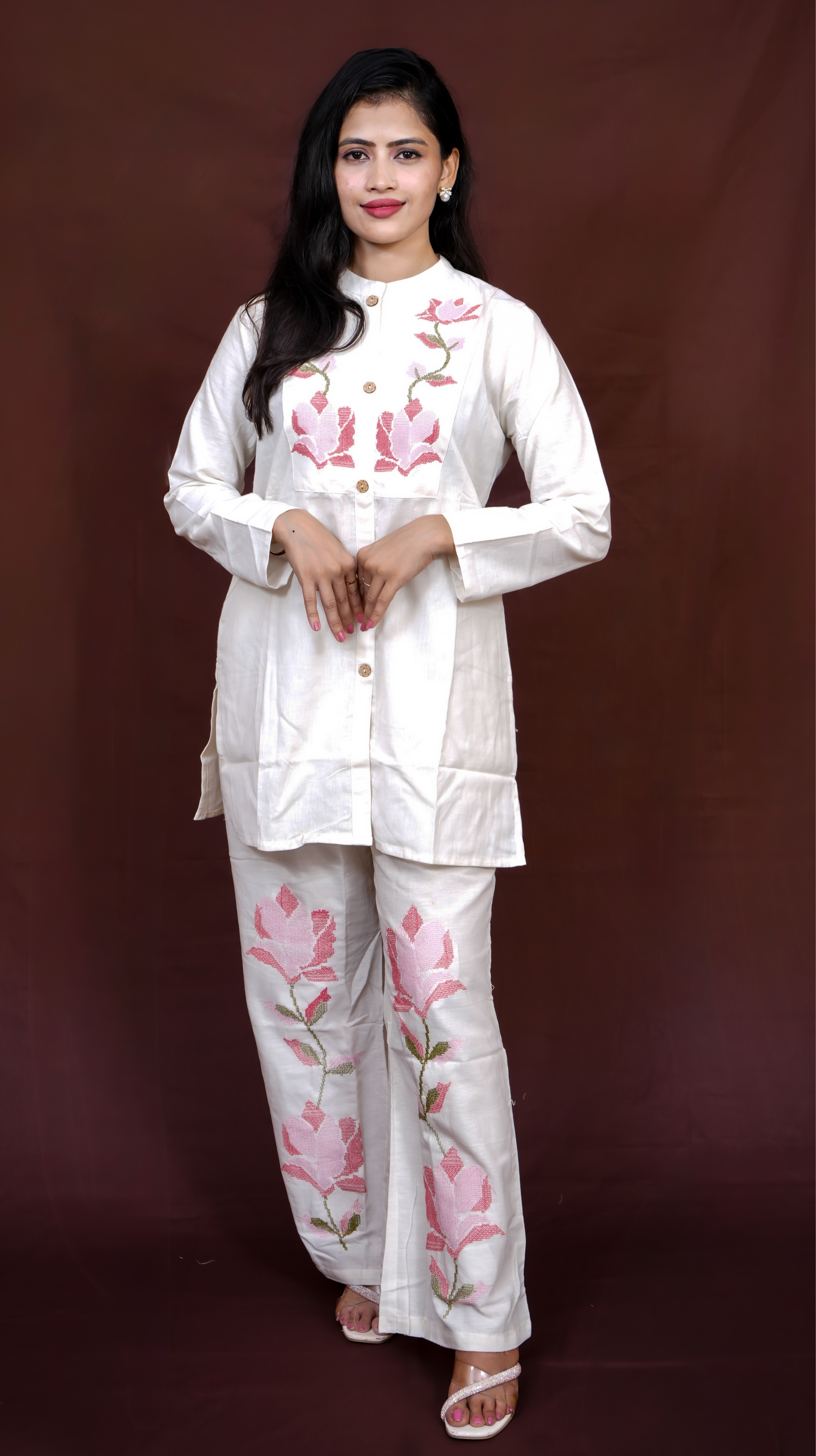 This elegant co-ord set blends classic charm with contemporary comfort. Crafted in a soothing off-white fabric, the top features wooden buttons and is adorned with beautifully detailed cross-stitch style floral embroidery in pastel pinks and greens. The matching pants carry the same embroidery for a cohesive and stylish look, making it perfect for relaxed occasions or casual ethnic outings.