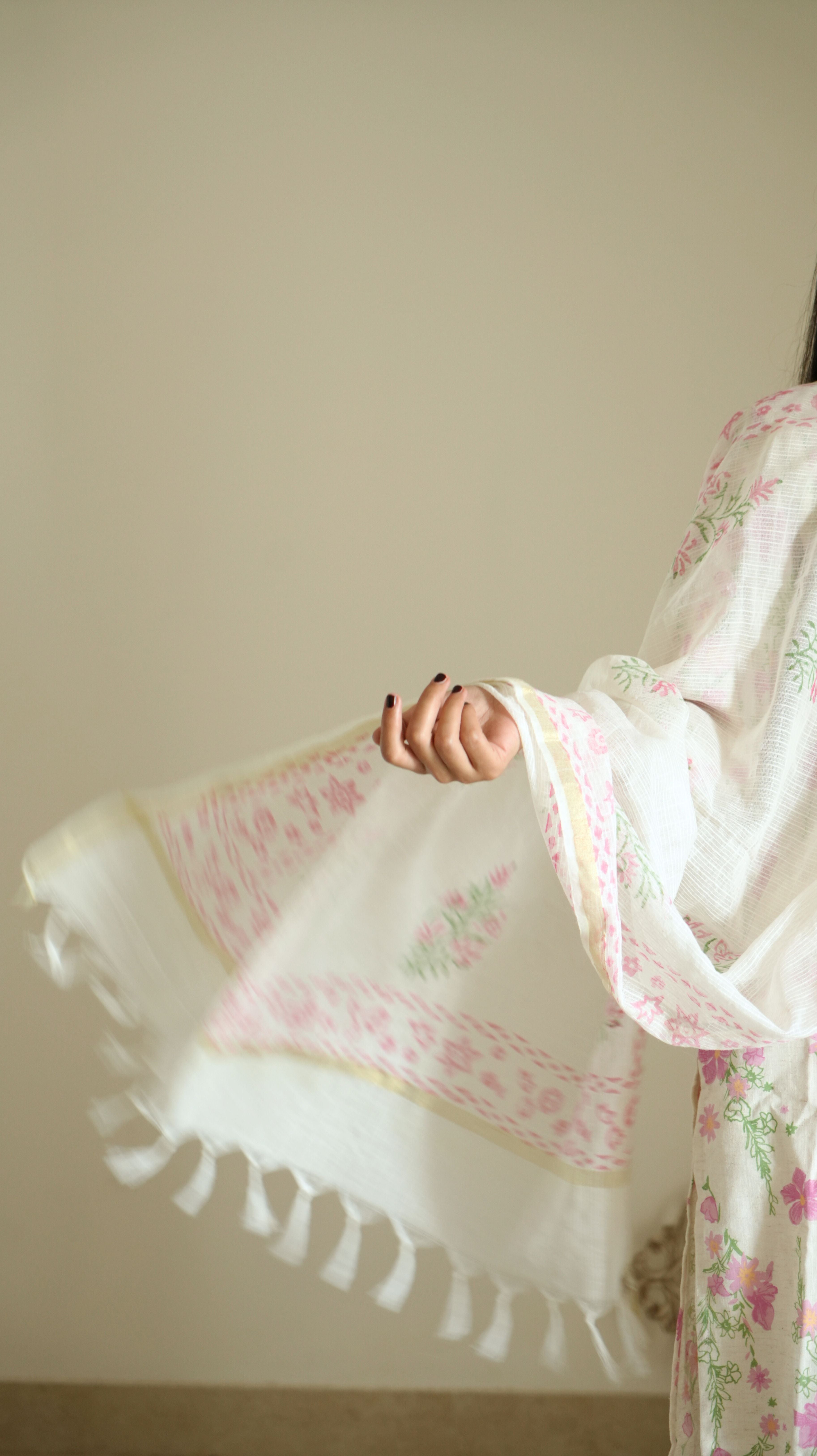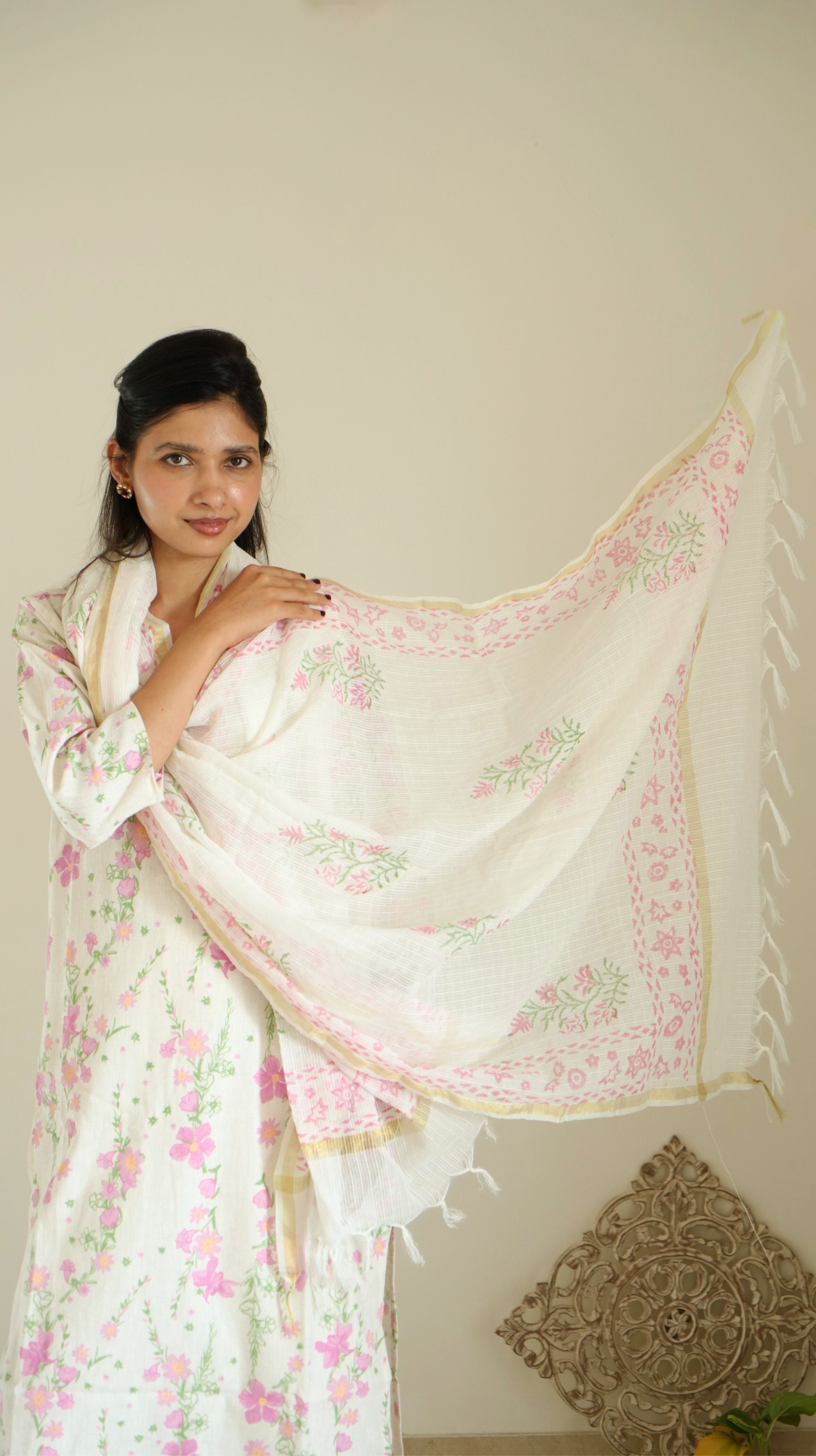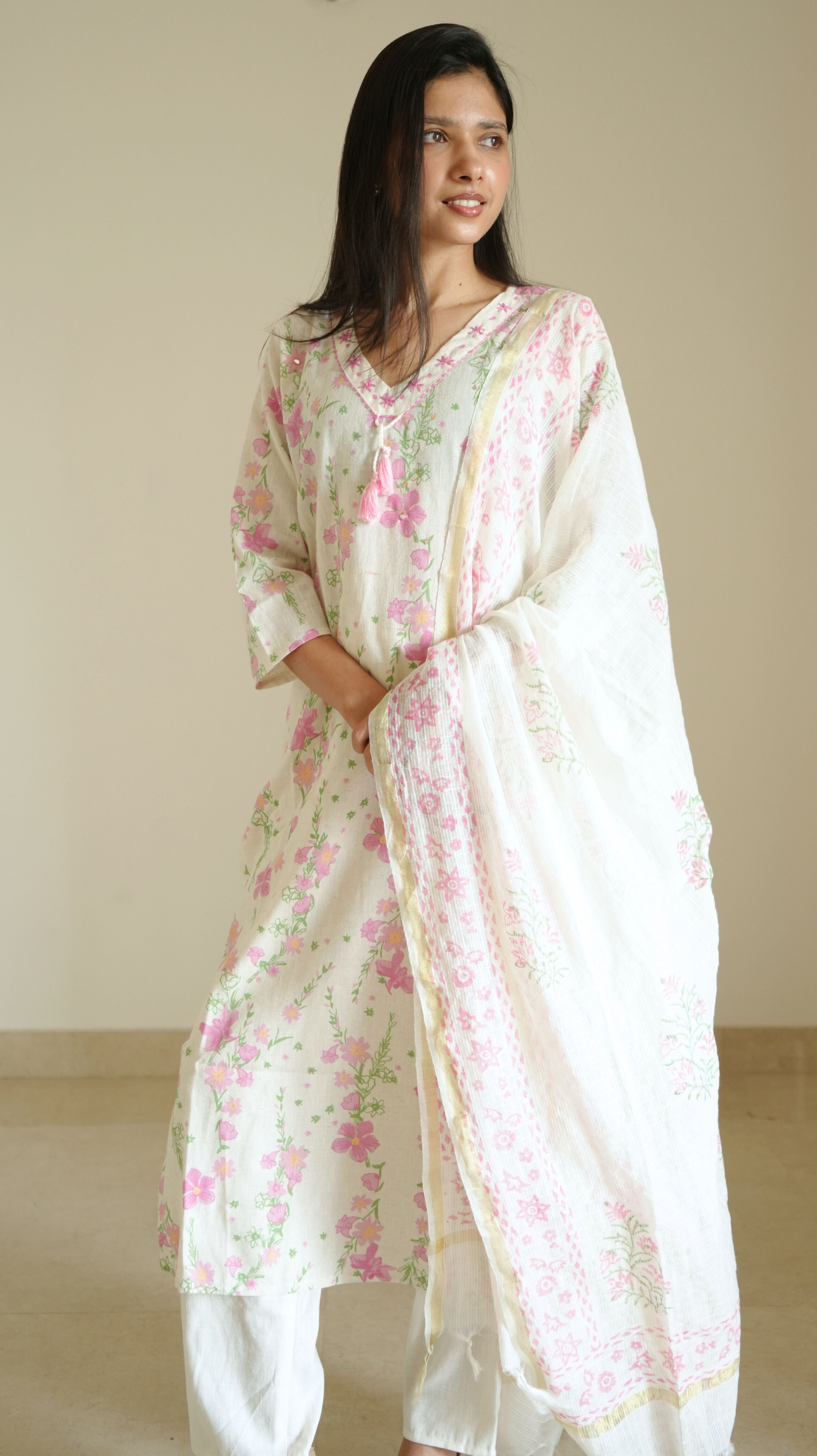 -Soft, feminine, and full of charm – this off-white kurta set is a beautiful pick for those who love subtle elegance. The kurta features delicate pink and green floral prints, highlighted with light mirror work and cute tassel ties. The neckline is adorned with dainty floral embroidery, adding to its handcrafted appeal. It is paired with solid white bottoms and a matching soft cotton dupatta with intricate pink thread embroidery and a gold edge finish.