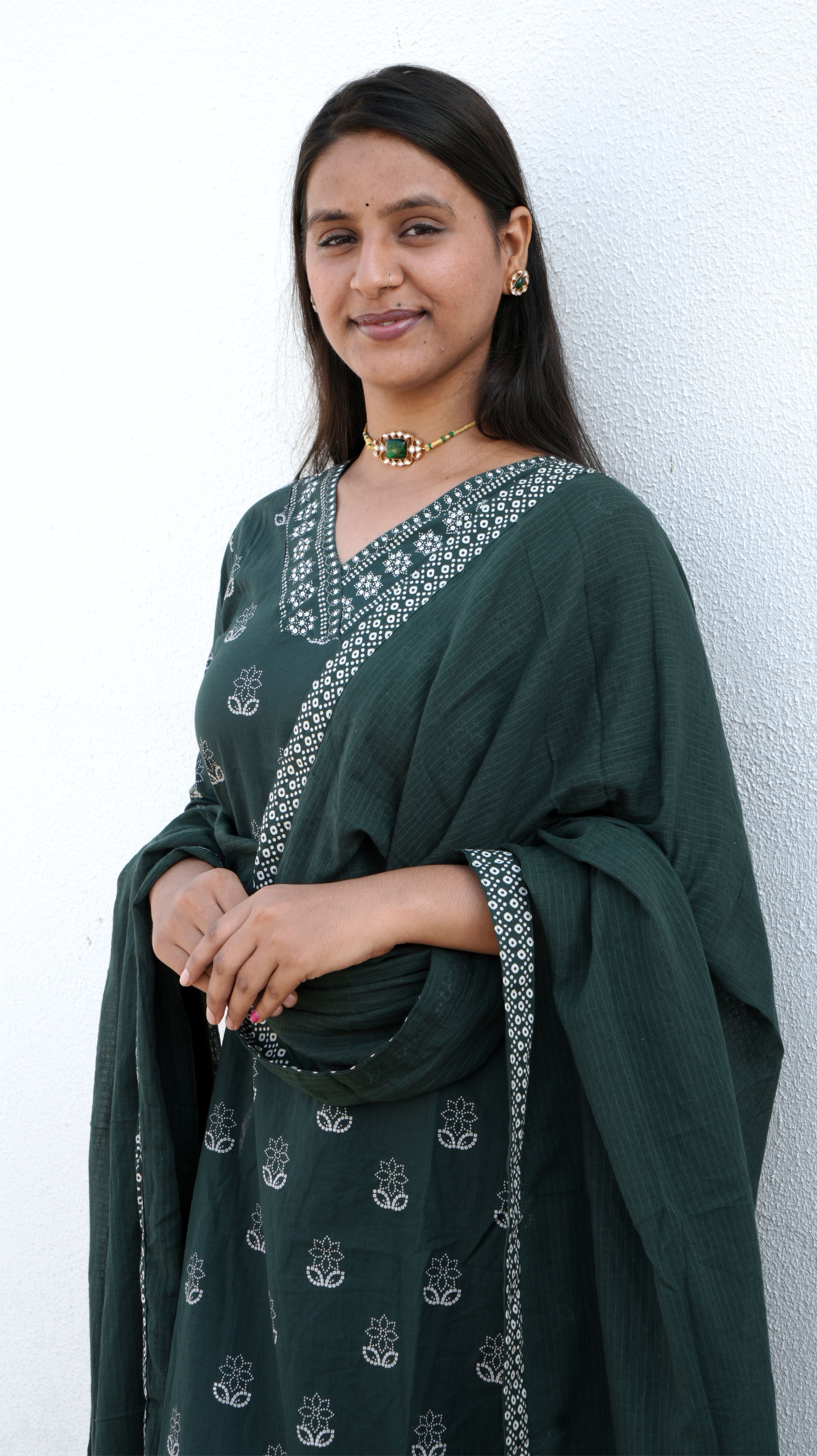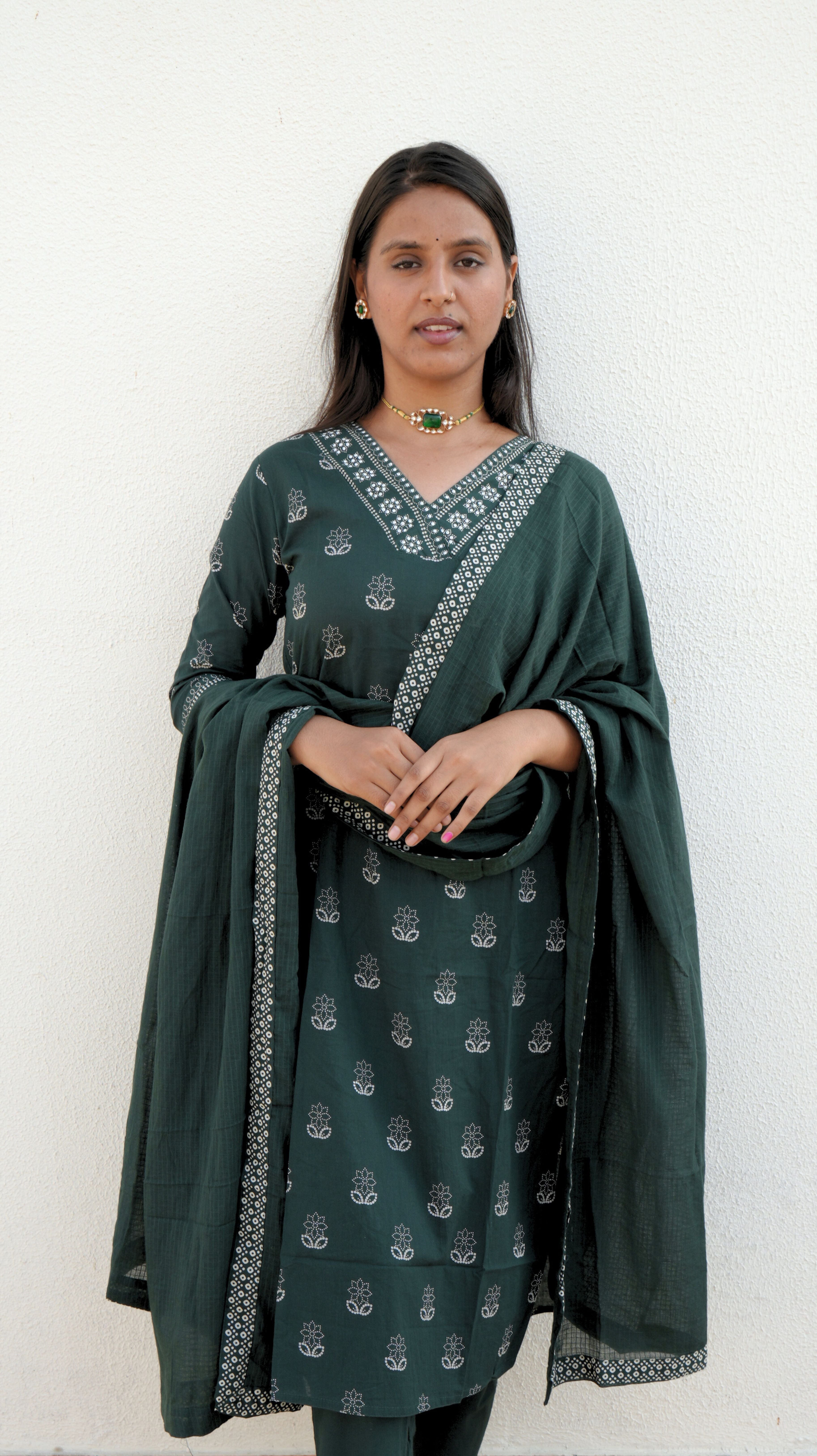 -Grace meets simplicity in this deep green ethnic kurta set, adorned with a delicate bandhani-style dot print. The kurta features a V-neckline enhanced with printed floral motifs in white, giving it a classy and traditional appeal. Paired with a plain matching bottom and a dupatta with minimal dotted borders, this set is a perfect pick for subtle festive charm or everyday elegance.